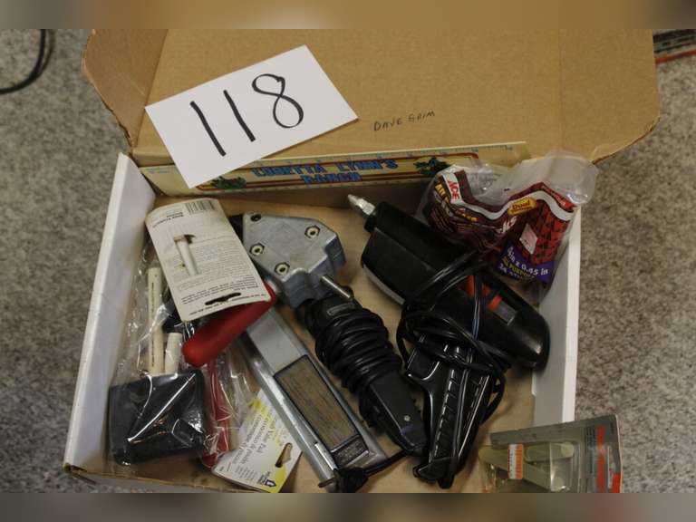 glue sticks, glue gun, paint brushes, ruler, Malco Turbo Shear, Craftsman engraver