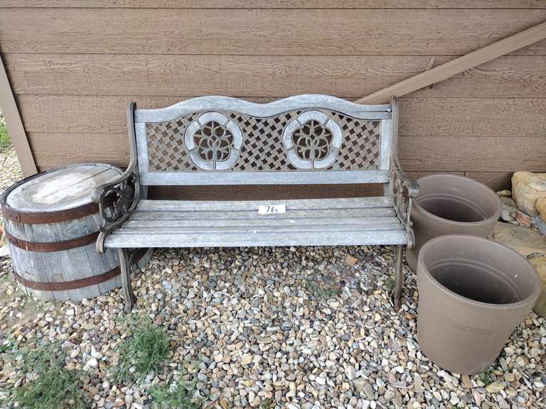 LOT 76 - Clay flower pots, wooden bench, and Wooden Whiskey Barrel